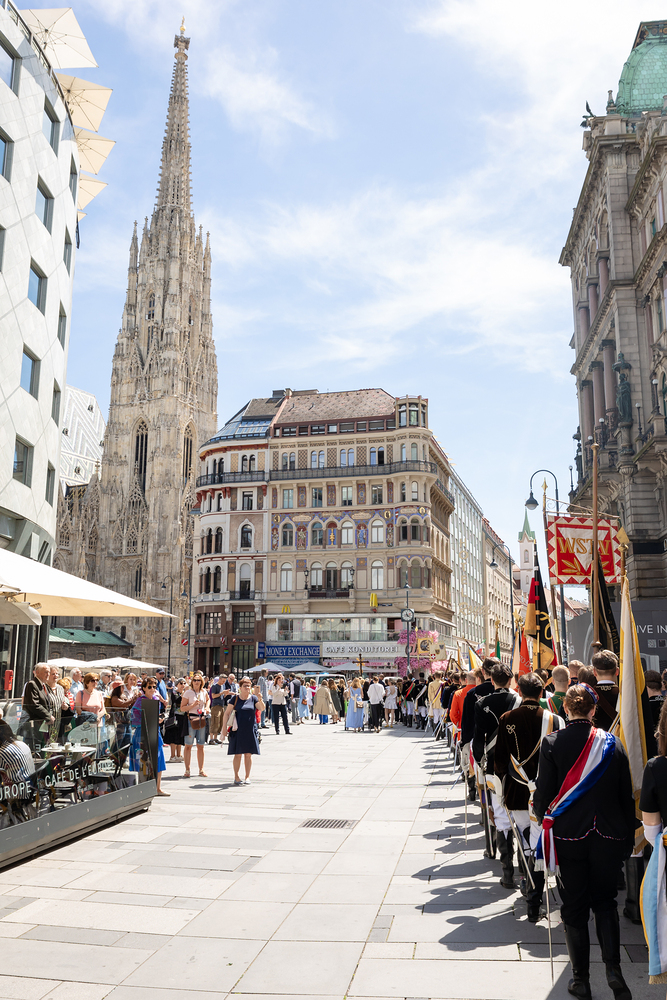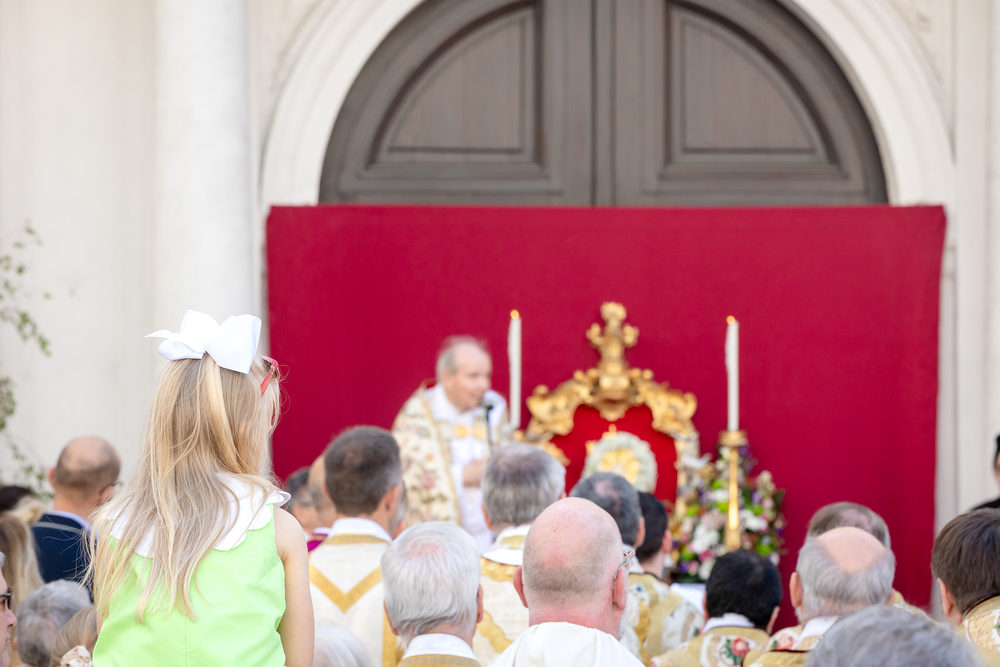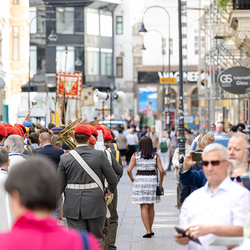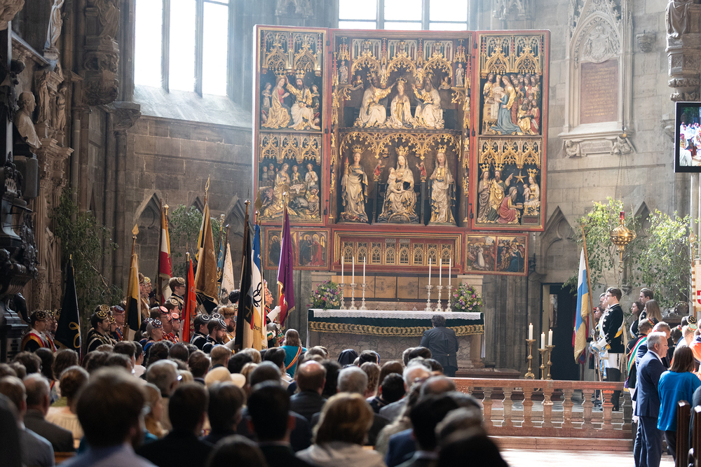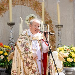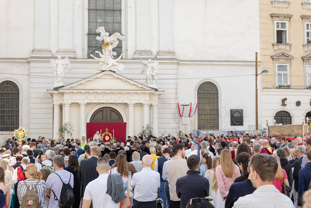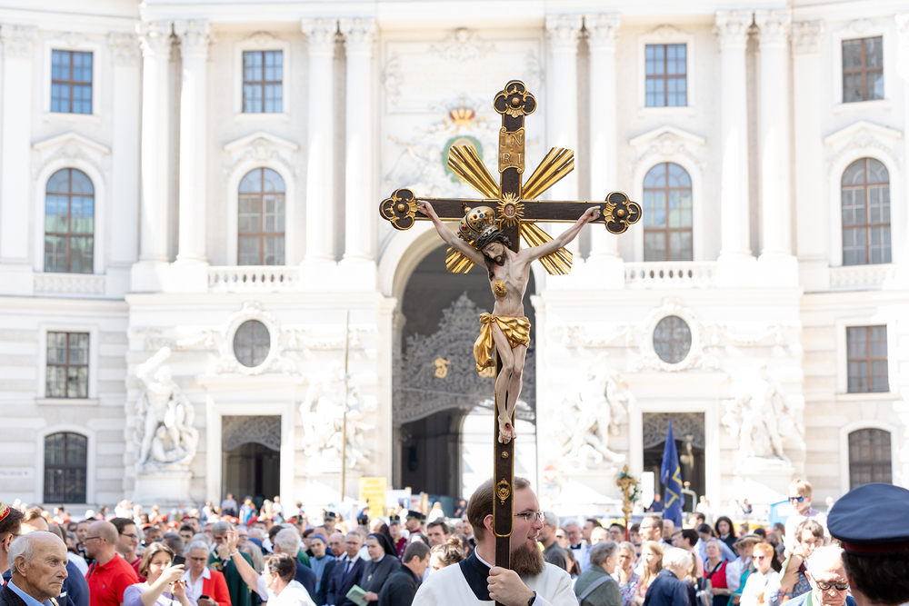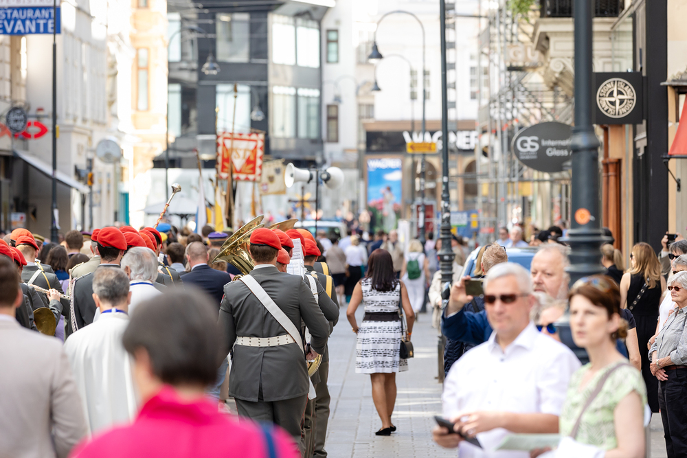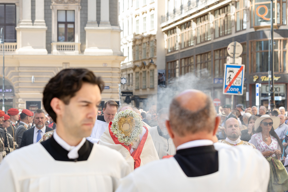 Zu Fronleichnam bringen wir Katholiken öffentlich unseren Glauben zum Ausdruck, dass Gott in Brot und Wein mitten unter ihnen ist. Als sichtbares Zeichen wird eine reich verzierte Monstranz mit einer geweihten Hostie in feierlicher Prozession durch die Straßen getragen.